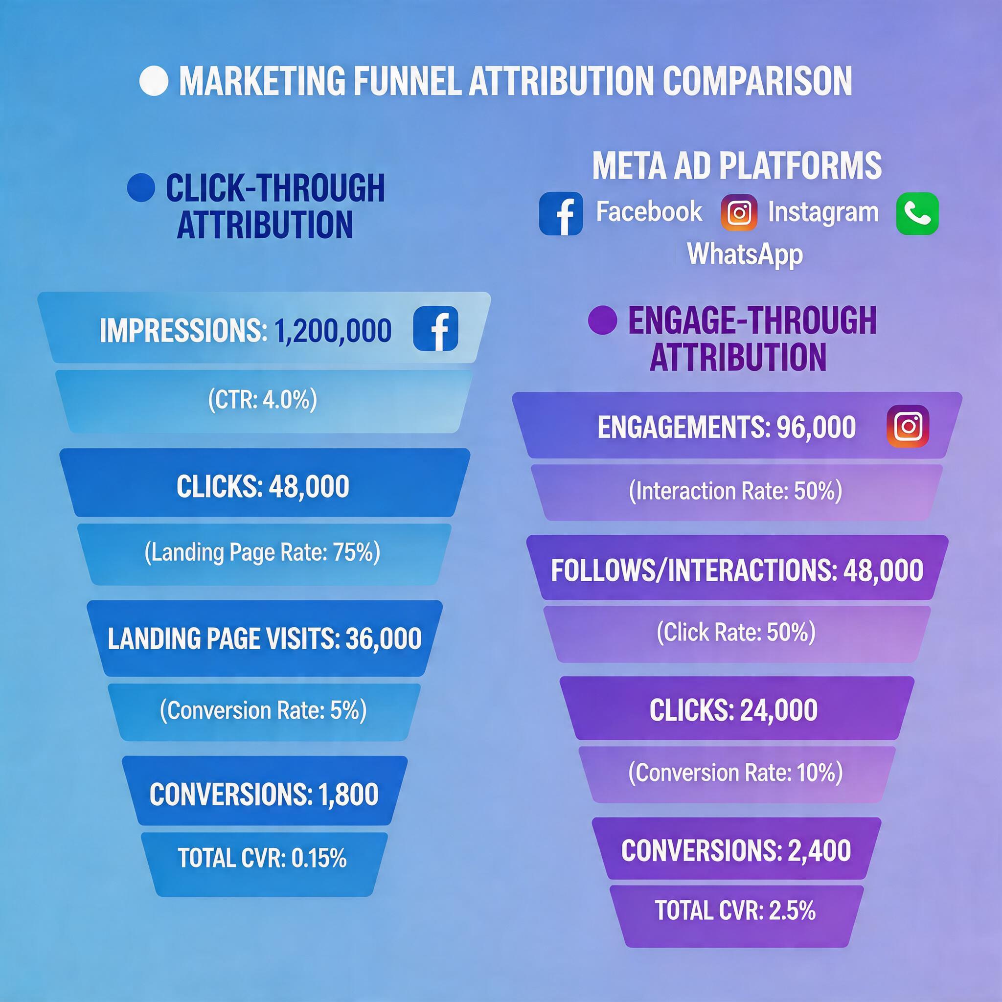 The practical effect: the same conversion event may now be attributed to your ad under engage-through that previously went unattributed under click-through. Your conversion volume appears to increase, which means your CPA — calculated as spend divided by attributed conversions — drops mathematically even if nothing about actual user behavior changed.